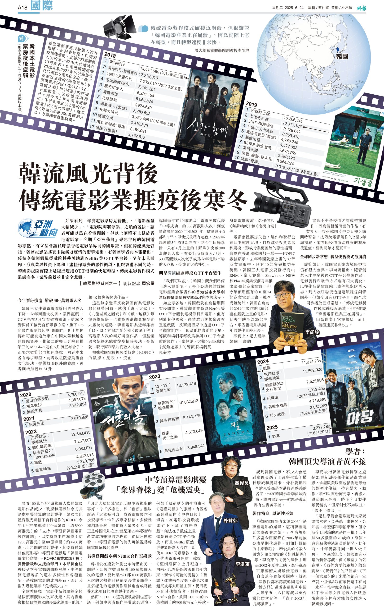 【明報專訊】如果看到「年度電影票房見新低」、「電影產量大幅減少」、「電影院即將停業」之類的說法,讀者可能以為在看港聞版,但以上困境不止見於香港電影業,今期「亞洲動向」專題主角的韓國電影亦然。有立法會議員呼籲香港電影業界向韓國取經,但在韓流風光背後,韓國電影業其實未從新冠疫情的衝擊走出。有韓國學者向本報指出,疫情令韓國觀眾從戲院轉移陣地到Netflix等OTT平台後,至今未見回歸,形成業界投資下降和上畫佳作減少的惡性循環,但跟香港不同的是,韓國影視圈實際上是經歷迎接OTT浪潮的快速轉型,傳統電影製作模式雖處寒冬,業界前景並非完全悲觀。