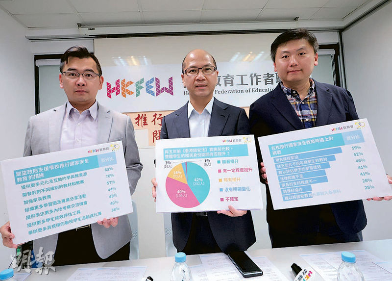 教聯會本月上旬以問卷訪問488名教師,約四成半是國民教育統籌主任。結果顯示,94%受訪者稱所屬學校會舉行升國旗儀式及「國旗下講話」,近五成會在「早會或班主任課舉辦相關教學活動」或「舉辦中華文化體驗活動」、四成會參與坊間國安教育活動等。