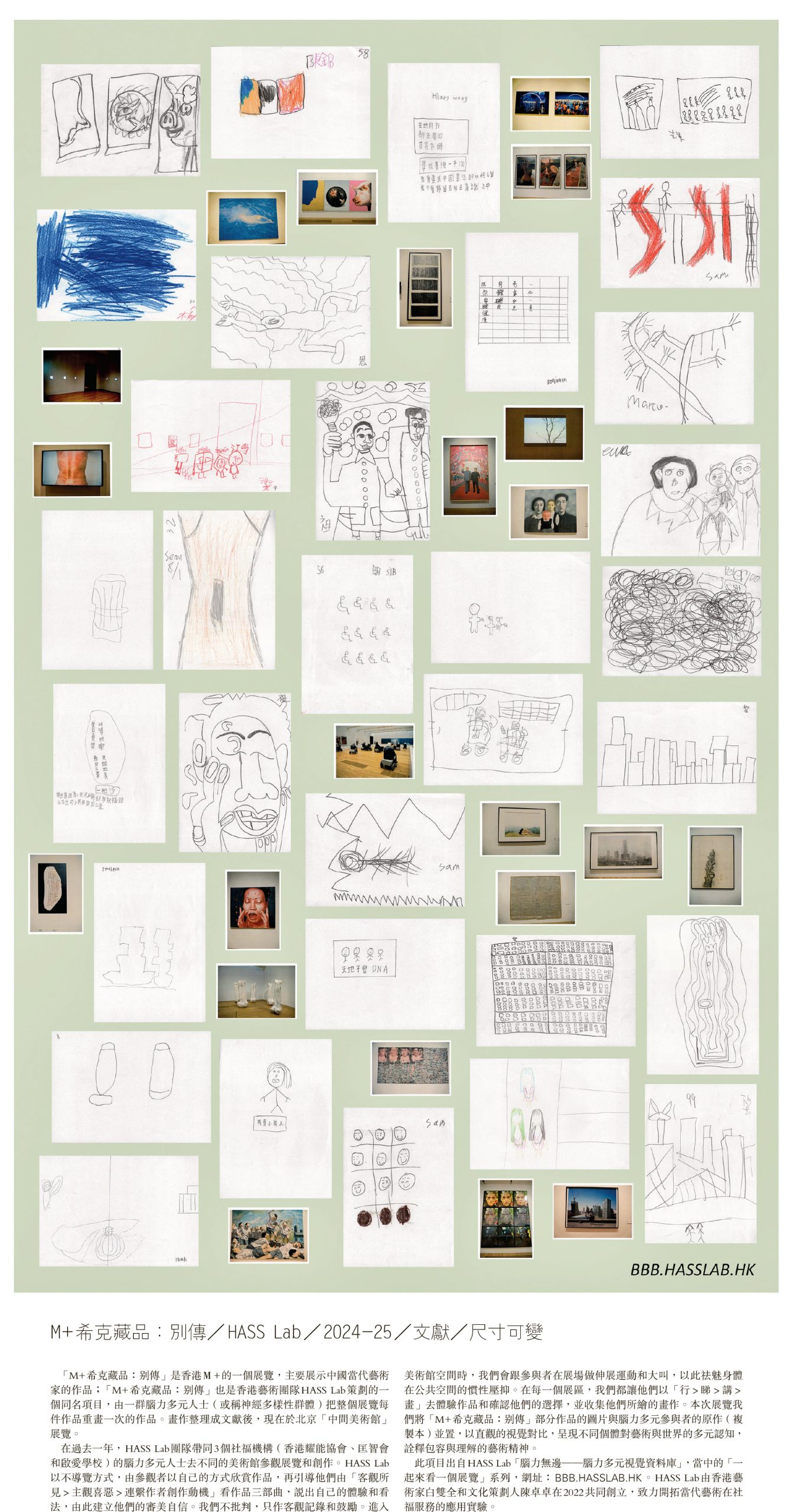 副刊 圖文城市:M+希克藏品:別傳/HASS Lab/2024-25/文獻/尺寸可變 發佈於 3 個月 前 2025 年 6 月 29 日 By 明報 【明報專訊】「M+希克藏品:別傳」是香港M+的一個展覽,主要展示中國當代藝術家的作品;「M+希克藏品:別傳」也是香港藝術團隊HASS Lab策劃的一個同名項目,由一群腦力多元人士(或稱神經多樣性群體)把整個展覽每件作品重畫一次的作品。畫作整理成文獻後,現在於北京「中間美術館」展覽。 相關文章:星期日生活 Up Next 軟硬假餌:不同形狀 吸引不同魚種 不要錯過 美食廣場高CP值逆襲 足料肉餅大玩「煙幕」|趁「熱」食 繼續閱讀 贊助商 猜你喜歡 誰人日記:預製菜與隆胸 寫生看世界:#05:最好的安慰 廚房戀愛論:鐵皮檔旁的貼地法菜——訪主廚Tiff Lo 印藝派:Outland:讓被忽視的華語聲音,在倫敦獲看見——訪策書人廖文熙 圖文城市:嗨,澳門! 開門讀書:維持穩定