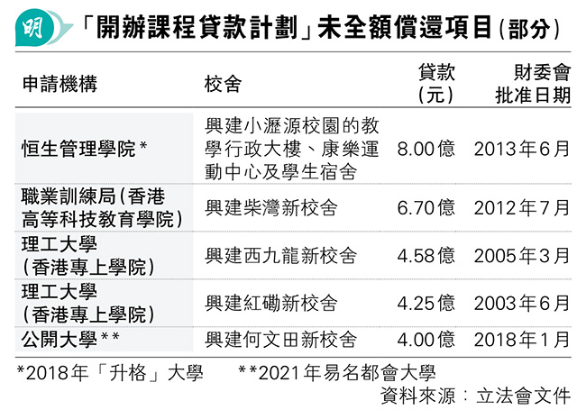 立法會教育事務委員會周五(7月4日)將開會,討論為都大提供開辦課程貸款。教育局所交文件顯示,政府自2001年批出40項貸款,18間院校獲得款項共76.825億元,當中49.152億已償還,27.673億尚待各校還款。計劃所批最高款項的一宗在2013年,恒生管理學院(現為恒生大學)獲8億貸款興建校舍設施及宿舍等,校方仍在還款,另有多間院校借款逾10年未還清(見表)。各院校一般可分10年還款,亦可申請延遲。