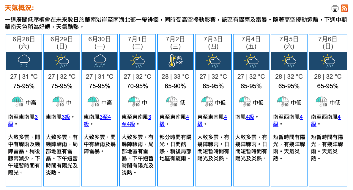 即時熱點 天氣|天文台:周六有驟雨及雷暴 最高31°C (19:27) 發佈於 4 個月 前 2025 年 6 月 27 日 By 明報 天文台表示,本港地區今晚(27日)及明日(28日)大致多雲,間中有驟雨及幾陣雷暴。早上最低氣溫約27°C。明日稍後驟雨減少,下午短暫時間有陽光,最高氣溫約31°C。吹和緩南至東南風。展望下周初間中有驟雨,局部地區有雷暴。(天文台) 相關文章:天文台天氣天氣速遞編輯推介 Up Next 香港迪士尼20周年 短片:米奇、迪士尼公主坐花車巡遊 熊抱青春記、優獸大都會角色初登場 (18:12) 不要錯過 家俬窗簾5招助家居降溫 (10:08) 繼續閱讀 贊助商 猜你喜歡 天文台上午8時40分錄18.4°C 今年入秋以來最低 (09:03) 天文台取消所有熱帶氣旋警告信號 (18:20) 天氣|天文台:周三有幾陣雨 市區最低19°C (20:57) 風神 | 緩慢趨向西南 海口3港停運 (00:34) 風神|教育局:幼稚園及部分特殊學校明日停課 (17:33) 天文台:下午5時20分直接發出三號強風信號 (12:06)