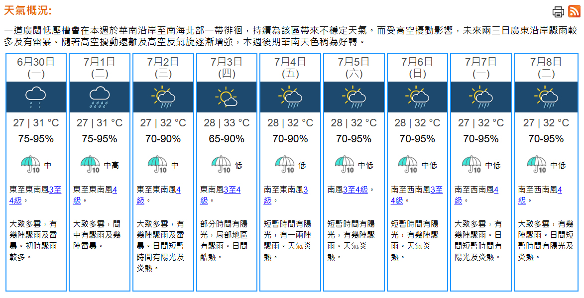 即時熱點 周一天氣預告|天文台:多雲有驟雨雷暴 (21:24) 發佈於 4 個月 前 2025 年 6 月 29 日 By 明報 本港地區明日(6月30日)天氣預測:大致多雲,有幾陣驟雨及雷暴,明日初時驟雨較多。氣溫介乎27°C至31°C。吹和緩東至東南風。展望周二間中有驟雨及雷暴。本周中後期驟雨減少,天色稍為好轉。(天文台) 相關文章:天文台天氣天氣速遞編輯推介 Up Next 天氣|天文台:周二有驟雨及雷暴 最高30°C (20:57) 不要錯過 香港迪士尼20周年 短片:米奇、迪士尼公主坐花車巡遊 熊抱青春記、優獸大都會角色初登場 (18:12) 繼續閱讀 贊助商 猜你喜歡 天文台上午8時40分錄18.4°C 今年入秋以來最低 (09:03) 天文台取消所有熱帶氣旋警告信號 (18:20) 天氣|天文台:周三有幾陣雨 市區最低19°C (20:57) 風神 | 緩慢趨向西南 海口3港停運 (00:34) 風神|教育局:幼稚園及部分特殊學校明日停課 (17:33) 天文台:下午5時20分直接發出三號強風信號 (12:06)