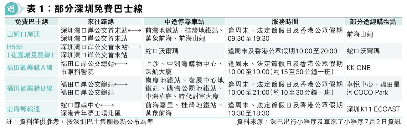 各種乘車優惠中,以免費乘車最划算。目前深圳不乏免費往返口岸及內地大型商場或超市的巴士線(見表1),一般於周末及香港公眾假期提供服務,如上月開通的山姆口岸通巴士線,便是來回深圳灣口岸公交首末站的免費巴士路線,途經前灣地鐵站、桂灣地鐵站、萬象前海及前海山姆。又如於福田口岸的福田歡樂購B線,為往來福田口岸公交總站的免費巴士路線,中途站包括崗廈地鐵站、會展中心地鐵站及購物公園地鐵站,意味巴士路線會途經卓悅中心和福田星河COCO Park等港人購物熱點。