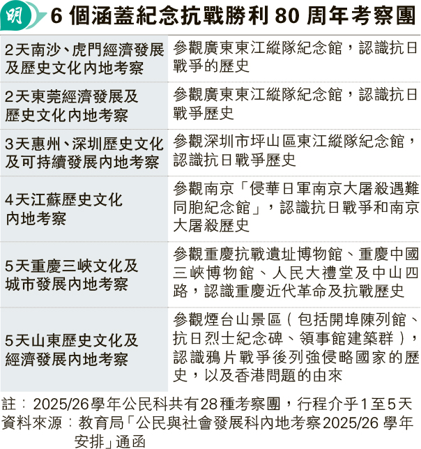 【明報專訊】教育局要求高中公民科學生參加內地考察團,昨向學校公布2025/26學年28款考察團及行程,當中18個為一至三天廣東省內行程。今年是抗戰勝利80周年紀念,前述28個團有6個行程與抗戰勝利有關,例如參觀東江縱隊紀念館、南京大屠殺遇難同胞紀念館等。考察團也着重「國家安全」教育元素,有一半團註明參觀地點具維護國家安全的意義。