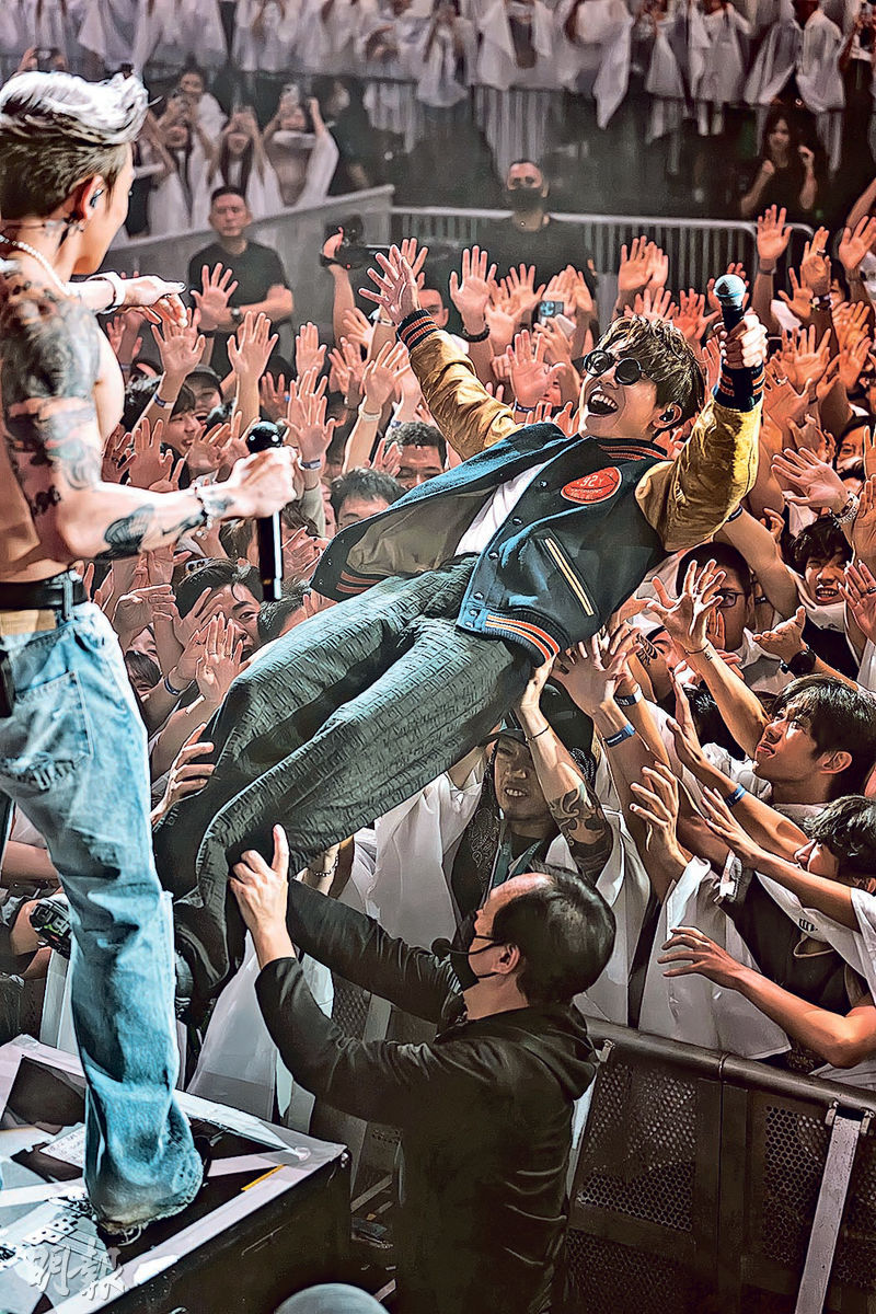 【明報專訊】Tyson Yoshi(程浚彥)前晚假啟德體藝館舉行第二場演唱會,適逢太太Christy生日,Tyson Yoshi除獻唱《Christy》,還邀全場合唱生日歌為太太賀壽。Christy坐王座兼手執玫瑰花升上台遭老公嫌棄,Tyson Yoshi稱不想收花並說:「明明叮囑導演不要給你咪高峰!」未知是否擔心Christy再公開閨房笑料,他以太太趕時間飛歐洲準備婚禮為由,與對方情深一吻代替讓她說話,還叫老婆將玫瑰花拿回家放好。