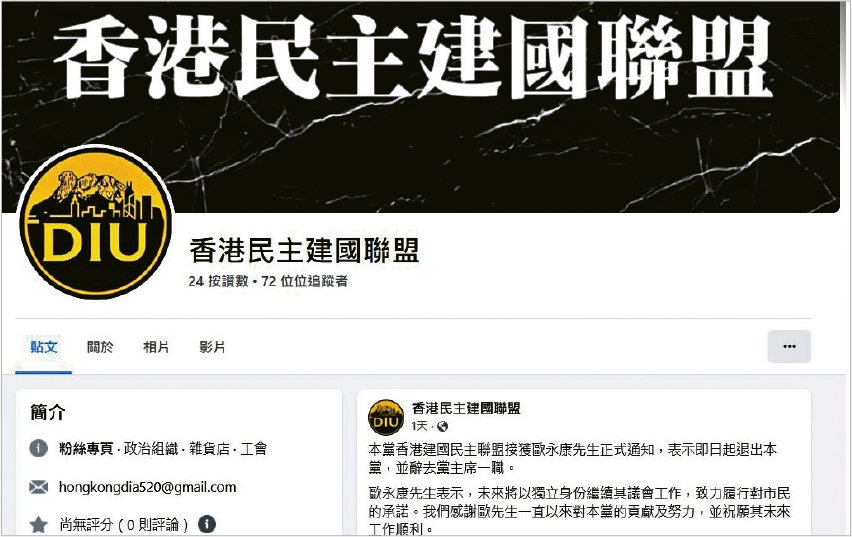 根據「香港民主建國聯盟」facebook專頁,截至昨午5時有76人追蹤及26次讚好,組織由海外港人組成,上月29日曾發帖文公布一項在台舉行的「升黑旗快閃行動」,今年曾派人參選境外名為「香港議會」的組織,包括活躍於反修例示威現場的姜嘉偉。保安局2022年前曾表明,「香港議會」涉嫌違反《港區國安法》顛覆國家政權罪,發起人袁弓夷其後亦被警方懸紅通緝。