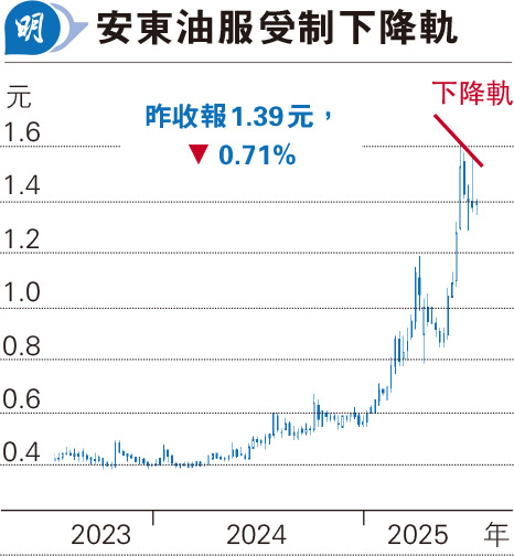 筆者認為,不論是Dhufriyah油田開發或AI檢測業務,只要未來發展得好,安東油服未來盈利將上一個台階,即使當中有不確定性,但筆者願意投管理層信心一票。技術走勢而言,安東油服周線上月次周由高位1.62元回落,出現下降軌,上月末周低見1.29元,昨收報1.39元(見圖),短期或仍有調整壓力,因此筆者擬候低增持。
