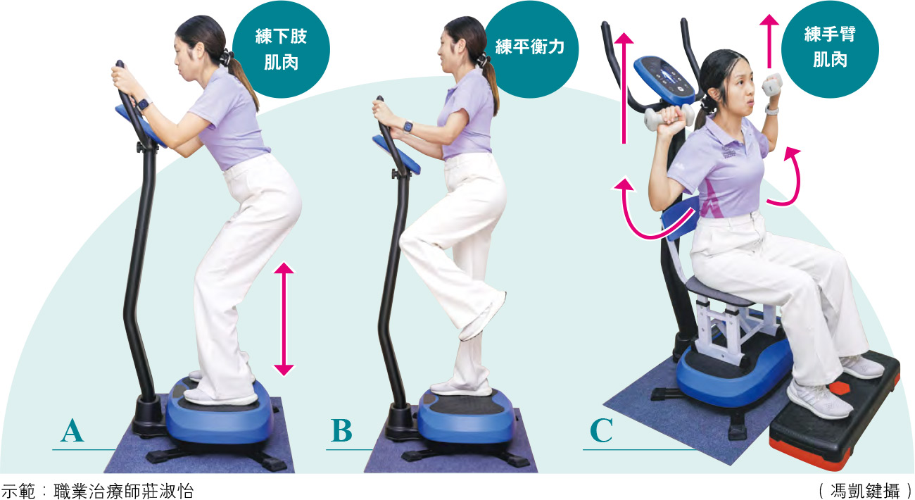 透過垂直震動機運動,可針對長者生活需要而鍛煉肌肉,物理治療師李晴峻指:「長者平日需要提重物、晾掛衣服,可做提舉動作,訓練二頭肌或兩側肩膀肌肉;而訓練下肢力量時,則配合淺蹲、深蹲或者單腳企。」