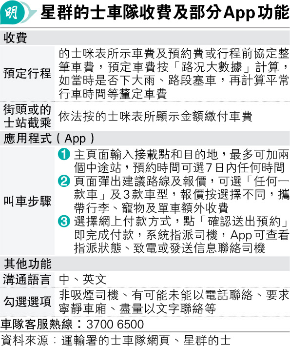 【明報專訊】星群的士車隊去年12月起試運,昨日正式獲發車隊牌照。星群昨稱,以車隊豪華6座的士車程計算,今年上半年已為市民及旅客提供約11萬總車程,又稱車隊司機每月平均收入較一般的士高30%,反映有效改善司機生計。不過,昨接載記者的車隊司機向本報表示,每日車隊訂單不足10張,同時亦有從其他網約平台接客維持生意。