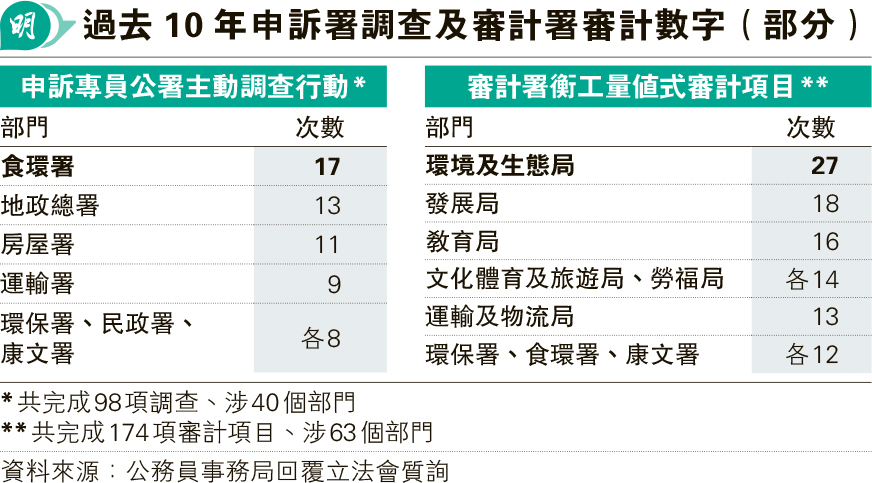 【明報專訊】公務員事務局長楊何蓓茵昨書面回覆立法會質詢,提到申訴專員公署過去10年共完成98項主動調查行動,涉及40個部門,當中食環署被主動調查共17次,次數最多;其次為地政總署、房屋署、運輸署等(見表)。楊何蓓茵解釋,部門受查次數多寡,可能與不同因素有關,例如服務性質及對象、當時社會關注等,不代表部門運作或表現情况,而過去10年不曾重複調查個別項目,主動調查的重大範疇則包括公共房屋、樹木管理、滲水、殯葬服務等。
