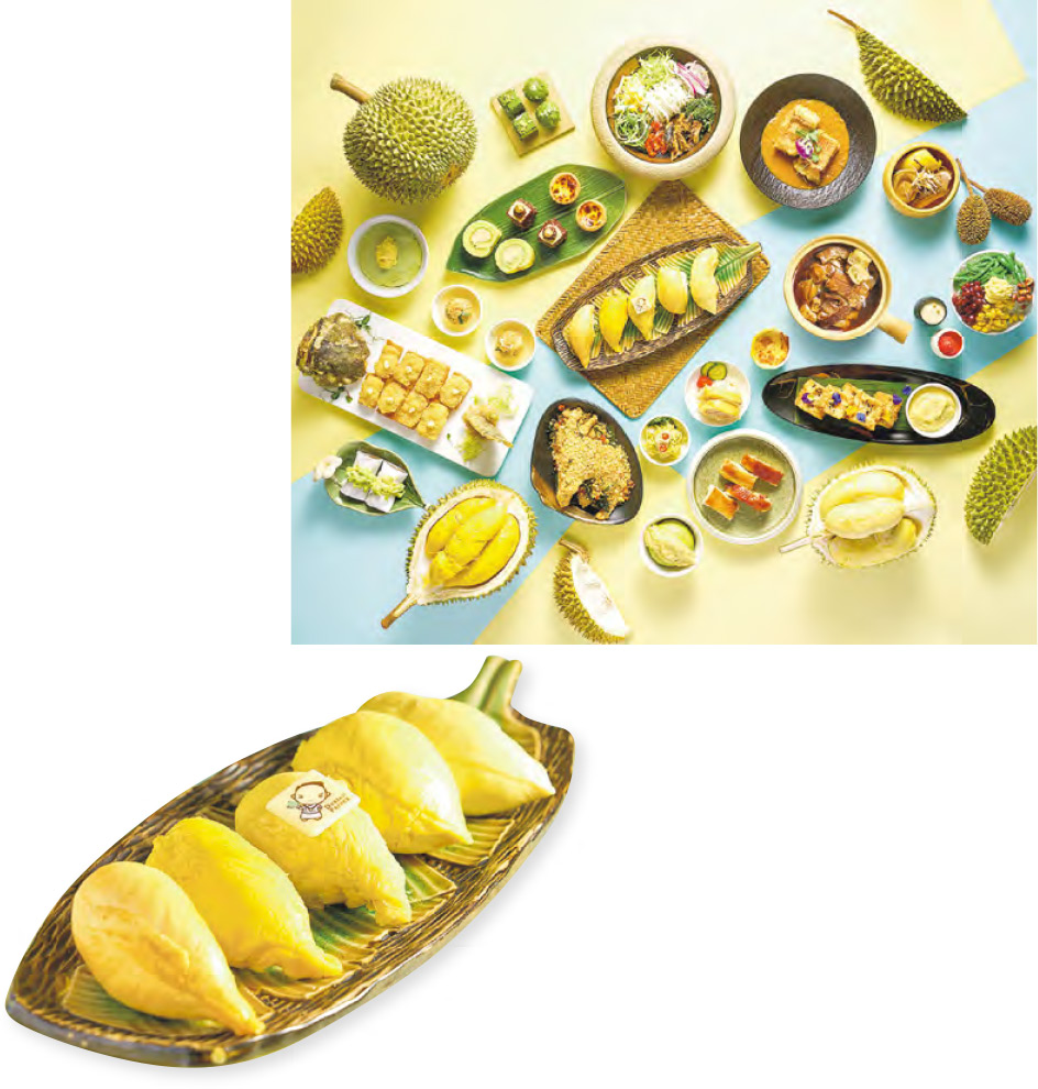 每名自助餐客人均可獲一份共5款品種的榴槤果肉拼盤,除了有D197貓山王、D200黑刺、D88小甜甜外,酒店行政總廚何偉誠亦從馬來西亞獨家引入「D-Putera普王榴槤」及「D-Diraja皇室榴槤」2款新品種,為本地榴槤控帶來新口味。榴槤拼盤之外,客人還可享用一份貓山王榴槤海鮮釀蟹蓋及XO榴槤鮑魚雪耳燉乳鴿湯。前者釀入多種海鮮如蟹肉、帶子及蝦仁,味道鮮甜;燉湯則於乳鴿、雞、金華火腿的肉香之中添上榴槤果香,為燉湯增添清甜香氣。