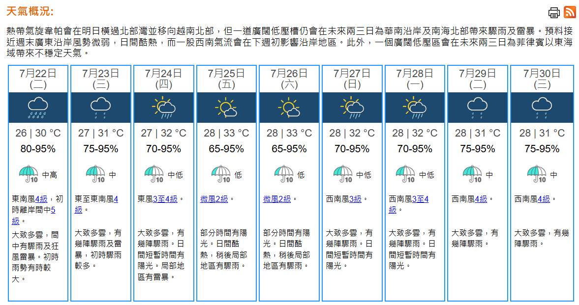 即時熱點 天氣|天文台:周二多雲間中有驟雨狂風雷暴 最高30°C (21:04) 發佈於 5 個月 前 2025 年 7 月 21 日 By 明報 天文台表示,本港周二(22日)大致多雲,間中有驟雨及狂風雷暴,初時雨勢有時較大,氣溫介乎26至30°C。吹和緩東南風,初時離岸風勢間中清勁,海有湧浪。展望周三(23日)仍有驟雨。隨後兩三日驟雨逐漸減少,日間部分時間有陽光及酷熱。 強烈熱帶風暴韋帕的外圍雨帶正影響廣東沿岸及南海北部,周一晚上8時,韋帕集結在河內以東約260公里,預料向西南偏西移動,時速約10公里,橫過北部灣並移向越南北部。 相關文章:天文台天氣天氣速遞 Up Next 釋永信商業化運作少林寺惹批評 10年前弟子投訴包養情婦 釋永信爭議一文睇 (17:24) 不要錯過 大灣區航空推$30來回機票 即日起至周五搶飛 (18:11) 繼續閱讀 贊助商 猜你喜歡 天氣|天文台:非常乾燥 日間最高22°C (08:47) 「天琴」橫行南海 黃岩島大暴雨 (01:43) 天氣|天文台:非常乾燥最高23°C 明早市區降至約15°C (08:24) 天氣|天文台:周四天晴非常乾燥 市區最低17°C (21:11) 天氣|天文台:本港今早較昨日低兩至三度 日間非常乾燥 (08:23) 天氣|天文台:周三天晴非常乾燥 早上清涼市區最低17°C (20:58)