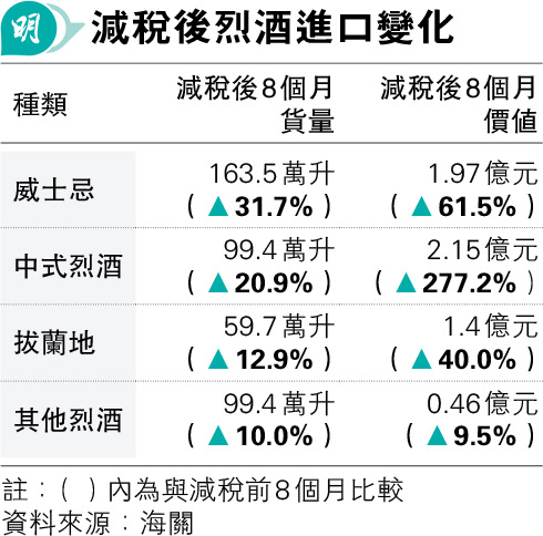 【明報專訊】政府自去年10月中起大幅調低高價烈酒的稅率,署理商務及經濟發展局長陳百里昨日回應立法會議員口頭質詢時表示,減稅後的8個半月、截至今年6月底,進口並完稅後的烈酒貨量及價值均較稅率調低前上升,反映政策有助本地烈酒貿易發展;惟目前政策實行時間仍短,成效有待觀察,暫未有計劃進一步調低稅率。