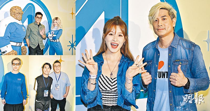 【明報專訊】古天樂、伍允龍與女友李蔓瑩、C AllStar成員吳崇銘,以及《中年3》歌手劉洋、李金凱及黃博等前晚到主題樂園出席西片《神奇4俠:英雄第一步》首映禮。Marvel迷古天樂跟現場的「石頭人」和「隱形女俠」影合照時,童心未泯躲在身形巨大的石頭人背後,令自己瞬間消失,引得全場大笑,影完相即急急入場,未有受訪。伍允龍公開與李蔓瑩戀情後首度一起出席公開活動,大方合照但分開接受訪問,他們稱不介意情侶檔工作。