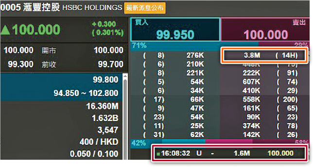 匯控昨高開見100元後即見沽盤湧現,午後低見99.3元,但其後穩步回升,終於收市競價時段以全日高位100元收市,但百元大關仍有1400個沽盤列陣,合共380萬股待沽,涉資3.8億元。