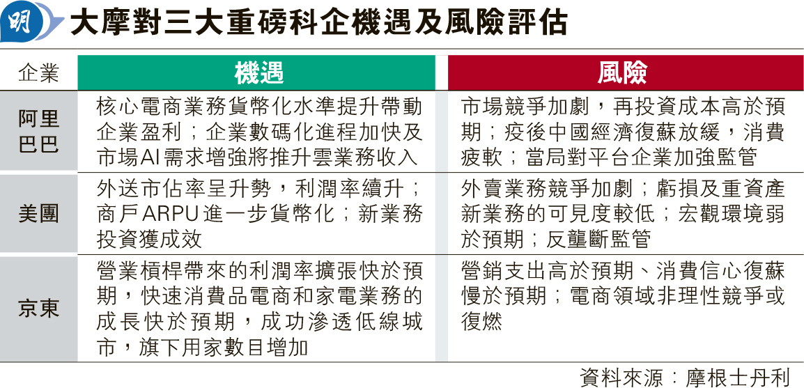 不過,針對美團,該行還表示,其外送市佔率呈升勢且利潤率續升、商戶ARPU(每戶平均收入)進一步貨幣化,對公司自身屬利好。至於阿里,該行認為阿里核心電商業務變現能力提升、市場AI需求增加推升雲業務收入等因素將繼續推動公司盈利。至於京東,大摩則點出該公司面臨營銷支出高於預期等問題,但也認為公司快速消費品電商和家電業務的成長快於預期,並成功滲透低線城市、旗下用家數目增加均為利好。值得留意的是,下月中開始上述3間公司將陸續公布今年次季業績。