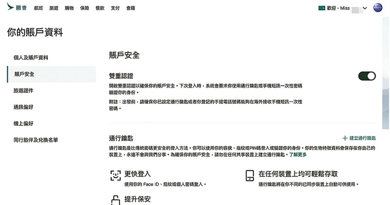 本報昨試在國泰手機應用程式登入,發現雙重認證功能由用戶自選啟用,並非強制,若沿用傳統方式,則以電郵地址、電話號碼或會員號碼,配合密碼登入。用戶另可選擇用「通行鑰匙」,即以人臉識別、指紋或PIN碼登入。開啟雙重驗證用戶登入時,需先後提供短訊及電郵驗證碼,而無論有否開啟雙重認證,登入後如欲在「兌換名單」加入其他用戶成員以便分享里數,均須再次提供一次驗證碼。