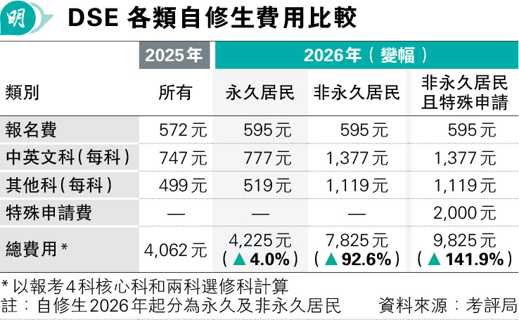 【明報專訊】2026年中學文憑試(DSE)考試費將全部加價,其中語文科每科加至777元,其他科目則加至519元。以報考4科核心科和兩科選修科為例,學校考生總考試費為3630元,按年加價140元,增幅約4%。因應自修生人數增多,考評局將引入「兩級制」,按香港永久居民和非香港永久居民劃分自修生收費,其中非永久居民自修生每科須多付600元。考評局稱加幅已考慮一般家庭負擔能力。