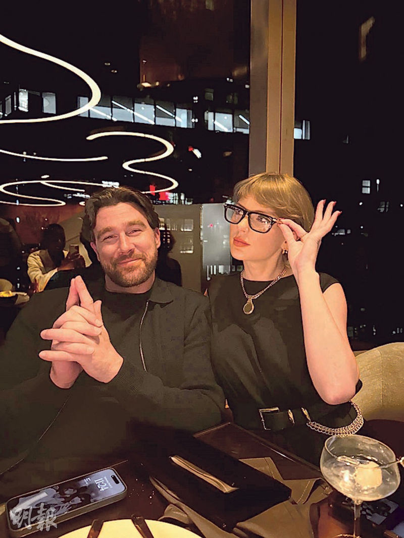 【明報專訊】不經不覺,美國樂壇天后Taylor Swift與美式足球員男友查維斯卻斯(Travis Kelce)拍拖已兩年,感情穩定。男方昨日透過社交媒體公開多張生活照,總結他在賽季結束後跟女友或親友一起滑雪、釣魚、打冰上曲棍球等歡樂時光。有眼利的網民在其中一張餐廳「撐枱腳」照片上,發現查維斯的手機桌布正是他跟女友合照,大方放閃。