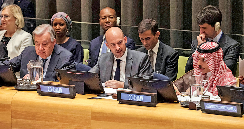 【明報專訊】法國和沙特阿拉伯周一(28日)起在紐約聯合國總部領導主持3天會議,旨在推動承認巴勒斯坦國地位,作為結束加沙戰爭和平解決方案一部分。在以色列和美國杯葛該會議下,法國外長巴羅在開幕強調,兩國方案是解決以巴問題唯一方法。英國首相施紀賢近日也面對國會議員施壓要求承認巴勒斯坦國,周一在蘇格蘭與施紀賢會晤的美國總統特朗普,為英國承認巴斯斯坦國開綠燈,表明對施紀賢是否跟隨法國的做法沒有意見。其後,施紀賢周二稱,除非以色列同意停火,否則英國將於9月在聯合國大會承認巴勒斯坦國。