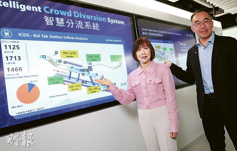 港鐵公司總經理(市場及客戶體驗)梁靜雯表示,系統已在啟德和宋皇臺站應用逾20次,透過不同顏色顯示月台擠迫程度,協助分流。她以6月周杰倫啟德演唱會為例,散場時系統顯示啟德站D出口乘客容量達六成,車站員工隨即引導乘客改用C出口。同時,港鐵亦在車站大堂熒幕以綠、黃、紅3色顯示月台候車情况,讓乘客知悉。