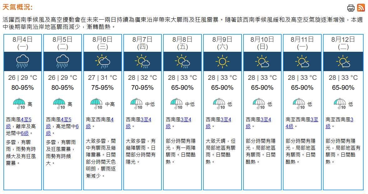 即時熱點 天氣|天文台:周一雨勢有時頗大 狂風雷暴 (19:22) 發佈於 3 個月 前 2025 年 8 月 3 日 By 明報 本港地區明日(4日)天氣預測:多雲,有驟雨,雨勢有時頗大及有狂風雷暴。明日氣溫介乎26°C至29°C。吹和緩至清勁西南風,離岸及高地間中吹強風。展望周二天氣仍然不穩定,雨勢有時頗大及有狂風雷暴。本周中至後期驟雨逐漸減少,漸轉酷熱。(天文台) 相關文章:天文台天氣天氣速遞編輯推介 Up Next 天文台特別天氣提示:周二狂風雷暴大驟雨 初時部分地區雨勢可能特別大 (20:56) 不要錯過 穿越戈壁 走入敦煌「莫高窟」感受千年藝術傳奇|展覽情報 (08:30) 繼續閱讀 贊助商 猜你喜歡 天氣|天文台:今早多處地區錄5毫米雨量 今日多雲有驟雨 下午部分地區雨勢較大有雷暴 (09:20) 天氣|酷熱警告生效 天文台:周末有一兩陣驟雨 (08:22) 天氣|天文台:周四天晴局部地區有驟雨 最高32°C (20:56) 今年10月已有4日達33℃以上 破1884年以來紀錄 (17:45) 天氣|天文台:天晴酷熱最高33°C 局部地區有驟雨 (08:14) 天氣|天文台:周三天晴酷熱 最高33°C (21:00)
