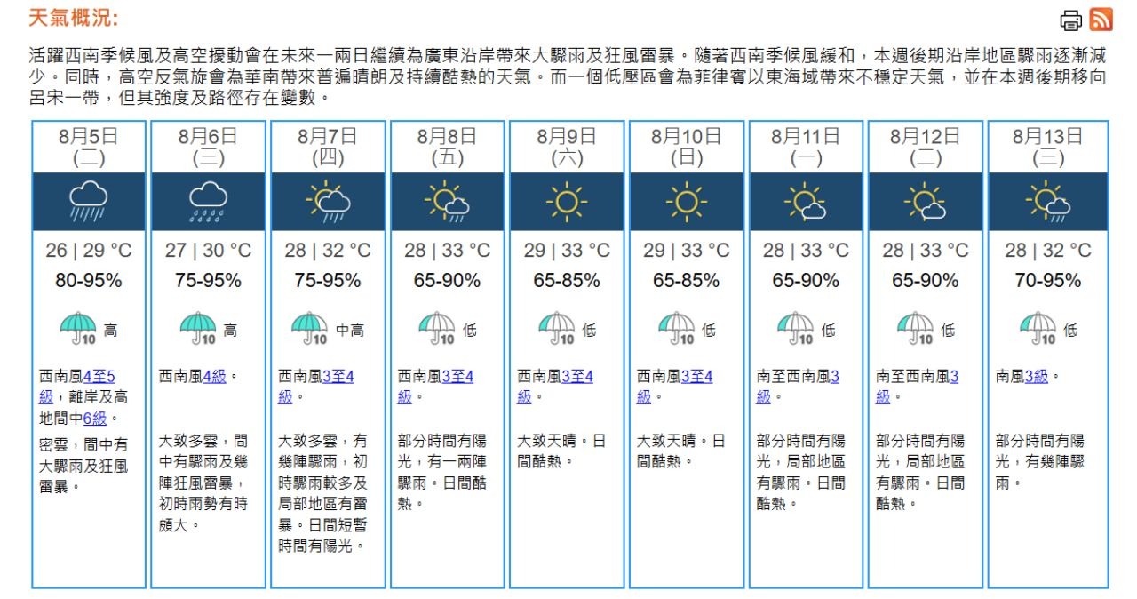 周二氣溫介乎26至29°C。吹和緩至清勁西南風,離岸及高地間中吹強風。周三(6日)天氣仍然不穩定,初時雨勢有時頗大。周四(7日)驟雨逐漸減少,隨後兩三日大致天晴及酷熱。(天文台)