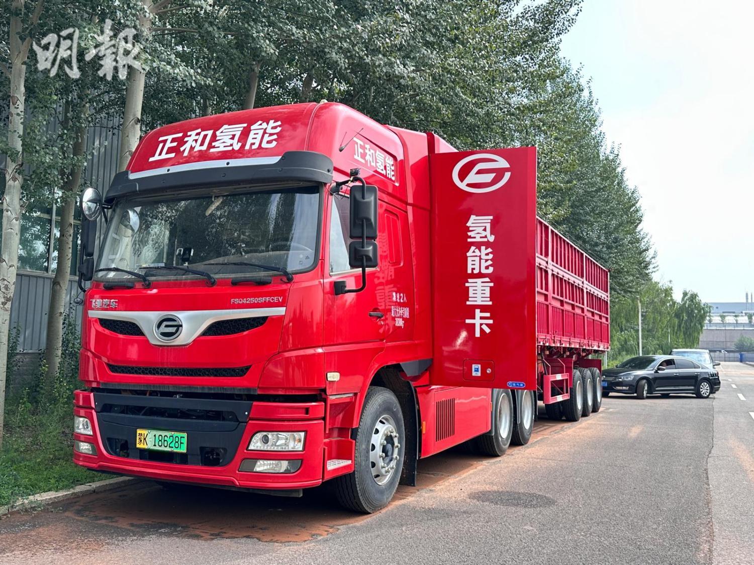 內蒙古資源城市鄂爾多斯,近年銳意發展新能源產業。走進當地的國鴻氫能科技有限公司,一輛輛紅色的氫燃料重型卡車份外搶眼。這些重型卡車不使用汽油。側面的罐槽裝有10個氫罐,只要加滿36公斤氫氣,就能「零碳」跑300公里。