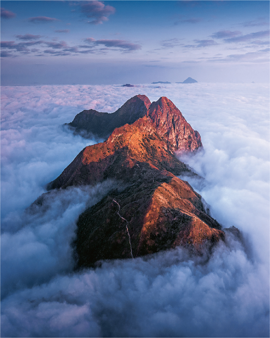 Kelvin 18歲始接觸風景攝影,2019、20年大學畢業前後開始到世界各地,尤其是荒野、極端天氣頻發之地攝影,也會定期在港攝影。Kelvin用兩張拍攝馬鞍山的照片,觀察到降雨量的變化。(圖1)是2020年1月拍攝,Kelvin說大多都是在春季——受海洋氣流影響——才會影到山被雲海環繞,那時的山整體偏啡紅色,但在2024年5月拍攝的(圖2),仍舊影到馬鞍山被雲海環繞,這時山卻已成綠色,他形容情况罕見,「要像我們前兩天下這麼大的暴雨,地面吸收很多水氣,才有機會在夏天出現這樣的雲海」。(圖3)攝於香港地質公園,Kelvin說這原本只是一塊普通石頭,但是在暴雨後變成一條小瀑布,這個他形容為「期間限定」的景色,是他在2022年6月一次紅雨後的翌日拍攝。