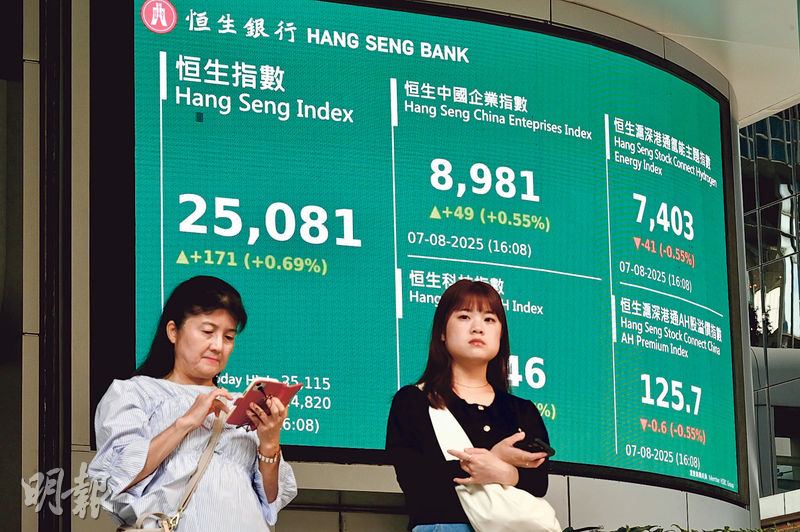 【明報專訊】內地7月以美元計價出口增長勝預期,加上在美減息預期下,美匯指數續軟曾穿98關,人民幣偏穩,都支撐A股、港股連日做好。滬指連升四日,上證綜指收報3639點,升幅0.16%。港股亦四連升,恒指企穩兩萬五關收市,創逾一周高。大市成交增加至逾2400億元,惟北水流入卻縮減逾九成至6億多元。