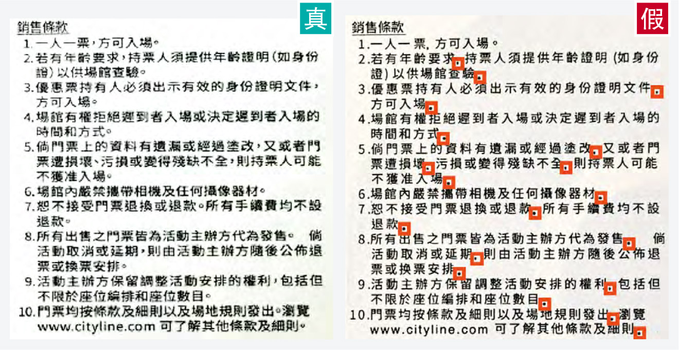 溫景亨又稱,門票的字體、紙質、防偽特徵皆高度仿真,但亦有破綻,例如英文條款「of identity」二字欠空格,以及中文條款標點符號間距不一致,建議市民如發現受騙,應致電3661 0110或9259 2537與東九龍總區刑事部聯絡。