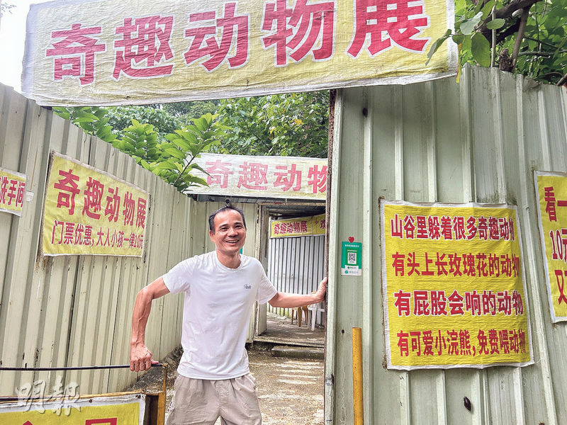 【明報專訊】沿着中山市華佗山公園左側小道一路向上,會看到兩道不到一米的圍欄大門,滿牆是黃底紅字標識,就連門頭也是一條黃色防水布。種種「荒涼」景象讓人很難相信這是一間動物園,卻有着全中山唯一的白豪豬、卡皮巴拉「老表」海狸鼠、會跟觀眾互動的白孔雀等動物。這間門票只要10元(人民幣,下同)的奇趣動物園,年初因網紅拍片推介而從門堪羅雀變為門庭若市,但園長明言不會因此加價或請人,繼續「一腳踢」。