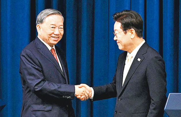 【明報專訊】相當於越南「一把手」的越共總書記蘇林(圖左)周日起國事訪問韓國4天,昨天(11日)與韓國總統李在明(圖右)舉行峰會,兩人承諾加強經濟及戰略合作,包括核能、高鐵及關鍵礦產等,應對充滿挑戰的全球貿易環境。兩國目標是2030年雙邊貿易額增加近一倍,達到每年1500億美元(約1.17萬億港元)。