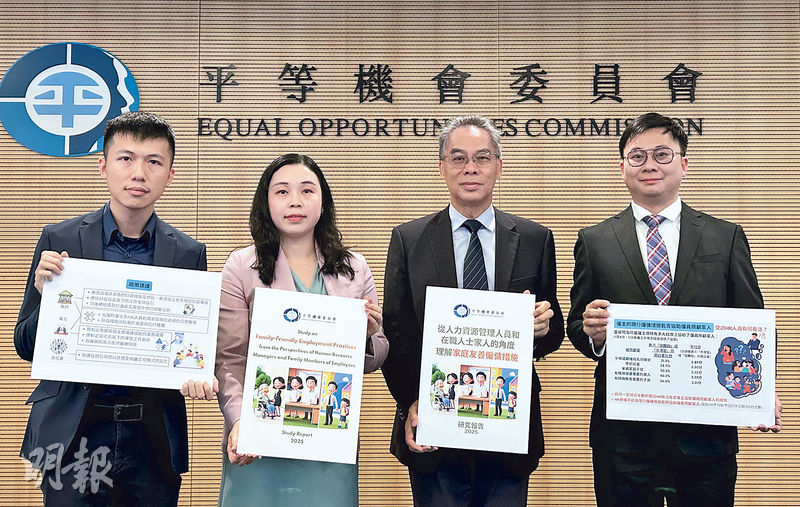 【明報專訊】需照顧家人的在職人士面臨雙重壓力,家庭友善僱傭措施可起紓緩作用。平等機會委員會昨公布「從人力資源管理人員和在職人士家人的角度理解家庭友善僱傭措施」2025研究報告,89.8%受訪人力資源管理專業人員(HR)稱,所屬公司或機構沒有關於家庭友善僱傭措施的指引或規則,又指僱主通常僅酌情提供有關措施;研究亦顯示HR普遍不認為現行僱傭措施能協助僱員照顧家人。平機會倡推廣在辦公時間以外完全脫離工作模式的文化。