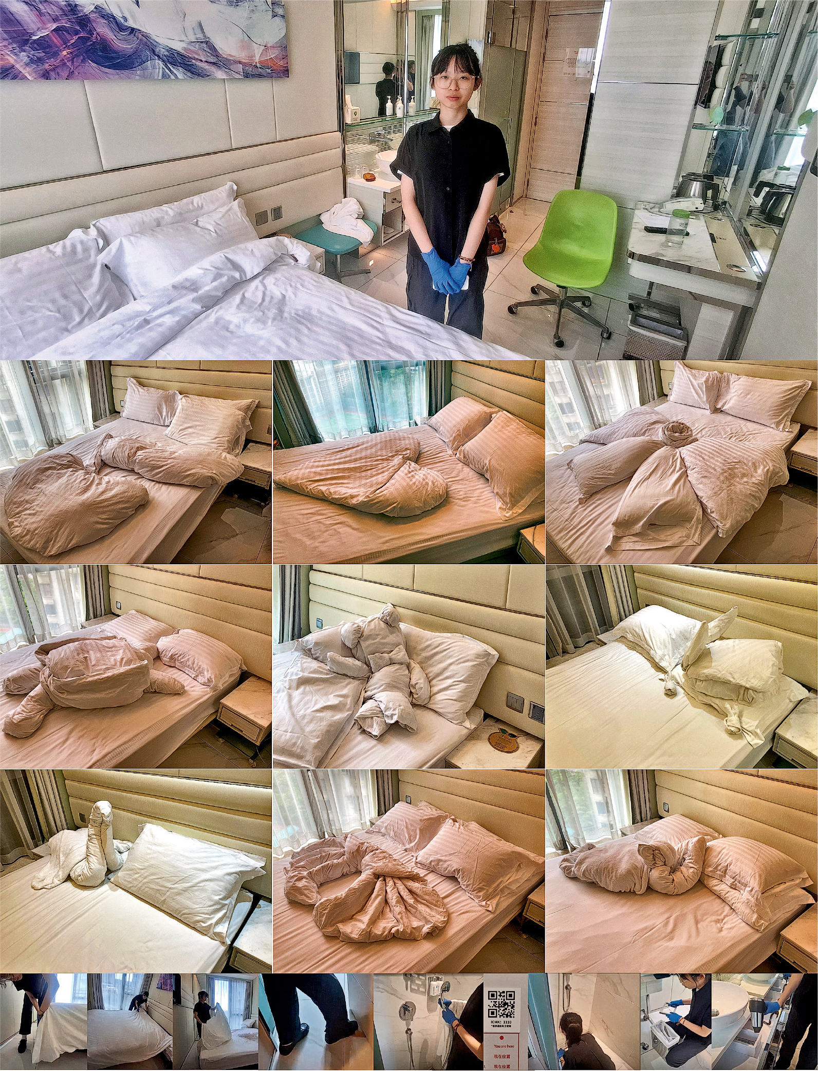 Betty向我介紹跟師傅學到的執房程序技巧:由敲門叫「house keeping」開始,記緊自備門擋,「掃」門背後的QR code開始計時。先將冷氣調校到最低溫,方便地乾除味;然後清理垃圾桶,記緊垃圾袋不可「著裙」(形容垃圾袋邊外露太多);然後檢查房間櫃桶夾萬,若發現客人遺留物件要通知「掃把」;然後鋪牀,「客房」(繼續住的)枕頭平放,「走房」(退了房的)枕頭就要倚牀背;然後洗浴室,用客人用剩的毛巾抹牆,由上到下,由內到外,還要扭開花灑倒走入面的水,避免滴水……