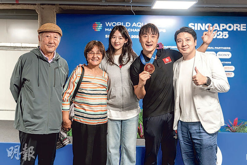 【明報專訊】45歲前港隊「飛魚王子」方力申退役21年,近年重投泳壇,8月到新加坡參加世界先進游泳錦標賽,共參與5項比賽,分別在200米背泳、400米個人四式與200米個人四式共奪得3面金牌,之後的100米和50米背泳分別獲第5和第6名。方力申在社交平台分享參與比賽的喜悅,是次賽事父母、弟弟與懷孕的太太葉萱(Maple)也到場打氣。他曬全家福照片,懷孕6個月的Maple腹部隆起但身形纖瘦。方力申說:「能在我父母、弟弟、太太,還有今年要出生的女兒一起見證我這塊金牌,真的是太完美。」方力申在比賽期間要到廣西演出,再返新加坡繼續比賽,夤夜趕飛機睡眠不足兼患感冒,帶病上陣仍獲好成績,果然寶刀未老。