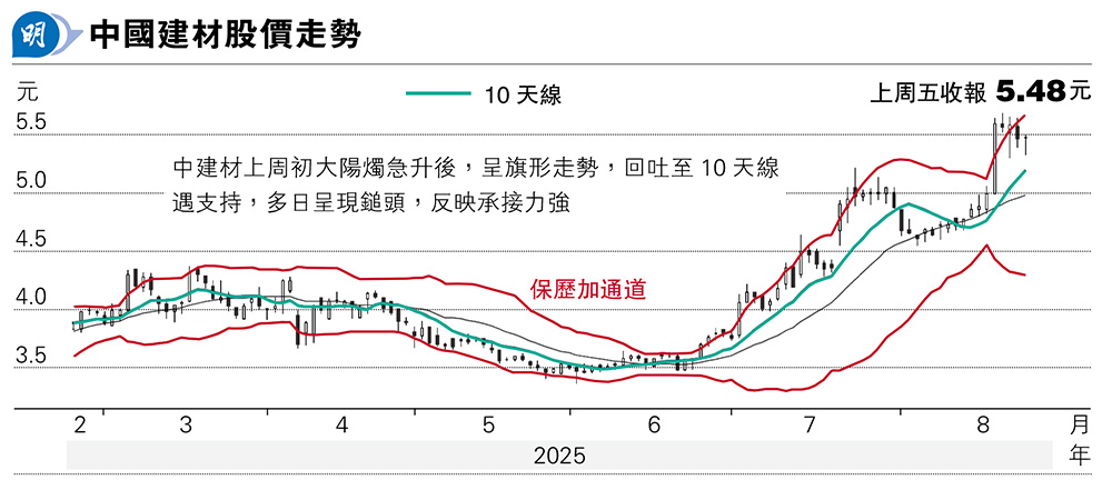 中建材去年底淨負債比率高達163%,利息開支達到純利的兩倍,因此減息對其盈利的正面影響很大。中建材上周初大陽燭急升後,呈旗形走勢,回吐至10天線遇支持,多日呈現鎚頭,反映承接力強,中短線可上望6元 。