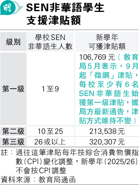 【明報專訊】本報今年5月報道,教育局在學界閉門會議透露9月新學年(2025/26)「微調」特殊教育需要(SEN)非華語生支援津貼,將門檻提高,每間學校至少要收6個這類學生,才獲發津貼。不過,局方臨開學前發學校通告,沒再提「微調」削津貼安排,稱新學年每校維持取錄1至9個SEN非華語生,可獲約10.7萬元津貼。津貼小學議會主席張作芳說,知道政府包括教育局要應對財赤,但認為始終不應減少對SEN生的支援。
