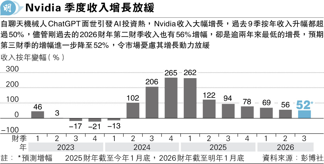 【明報專訊】受惠於科技巨企對數據中心的AI晶片需求持續強勁,美國AI晶片龍頭Nvidia(英偉達)(美:NVDA)在截至7月底的第二財季,收入按年增長56%至467億美元創新高。該公司已連續9季收入按年升幅超過50%,惟次季增幅是逾兩年來最低的增長(見圖)。Nvidia預計在截至10月底的第三財季收入為540億美元(上下浮動2%),意味按年升幅在52%左右,相比此前的爆炸式增長進一步放慢,儘管這預測未考慮中國市場的收入,卻令市場憂慮AI晶片需求增長可能陷入停滯。