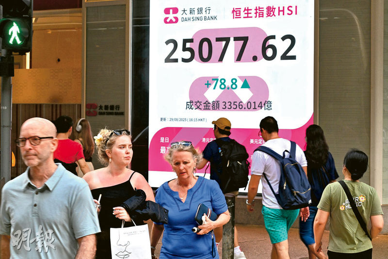 港股扭轉三連跌弱勢,恒指開市突破25,000點後窄幅上落,收報25,077點,升78點或0.32%。國指升0.35%,收報8947點;科指收報5674點,升0.54%。全月計,港股三大指數表現相對失色,恒指累升1.23%,國指累升0.73%,科指累升4.06%。大市昨天成交減14%至3356億元,北水轉淨流入120億元,全月淨流入1121億元,按月減17%。