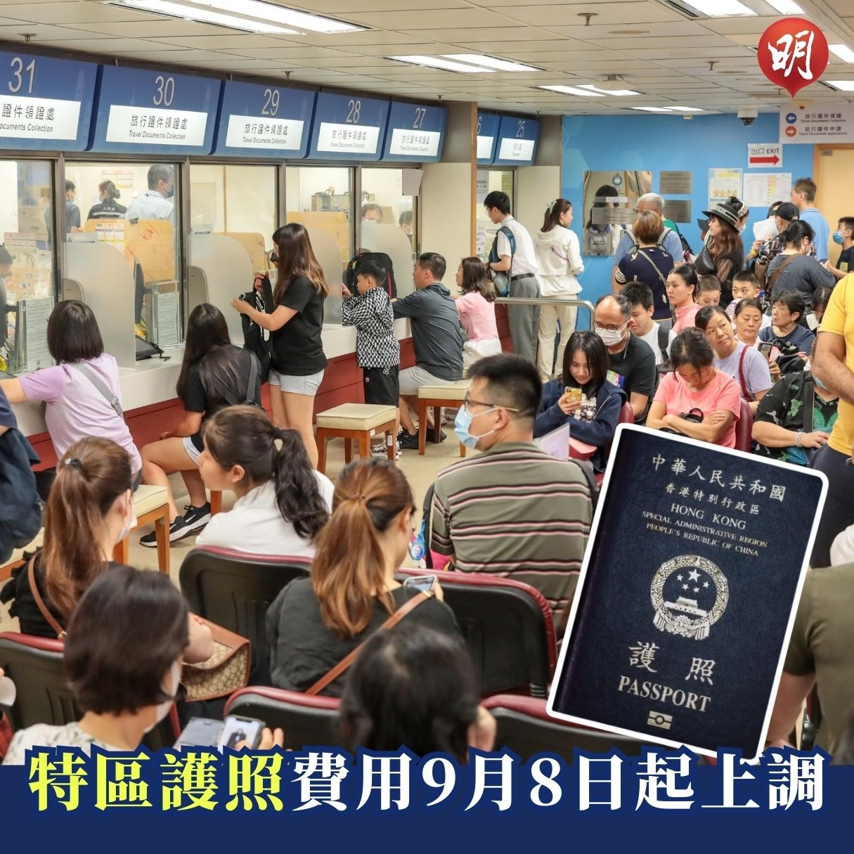 即時熱點 特區護照費用9月8日起上調 16歲或以上者護照費用增至$430及$520 (17:21) 發佈於 1 個月 前 2025 年 8 月 30 日 By 明報 不少港人喜歡去旅行,政府早前宣布入境處將於9月8日起上調香港特區護照費用,如特區護照即將到期可及早安排更換。 .16歲或以上者特區護照 32頁護照:原收費$370,新收費$430;48頁護照:原收費$460,新收費$520 .16歲以下者特區護照 32頁護照:原收費$185,新收費$215;48頁護照:原收費$230,新收費$260 新收費詳情 網上申請特區護照或預約申請旅行證件 相關文章:入境處新收費詳情旅行熱門HOTPICK特區護照網上申請特區護照或預約申請旅行證件編輯推介 Up Next 開學日交通|城巴九巴服務加強 口岸路線提供更早班次 (17:46) 不要錯過 漬物DIY短片示範:醬漬青瓜【附營養師貼士】 (09:03) 繼續閱讀 贊助商 猜你喜歡 加沙戰事滿兩年 51萬人陷饑荒 逾百兒童「皮包骨」餓死【短片】 (10:11) 中秋食滯了?中醫三茶飲助消滯 (09:34) 短片:法越野單車手12分30秒踩上巴黎鐵塔 破世界紀錄 (13:07) 賞月情報|中秋圓月是今年第三大超級月亮 中秋夜11時43分月上中天 (11:14) 中秋節|中秋交通一文睇 港鐵通宵 輕鐵電車免費搭 (09:21) 短片:神二十太空人中秋「加餸」享用月餅 遙距送中秋祝福 (16:51)