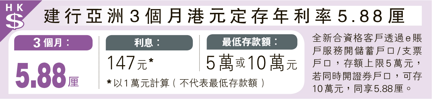 經濟 建行亞洲3個月港元定存年利率5.88厘 發佈於 1 個月 前 2025 年 9 月 3 日 By 明報 【明報專訊】全新合資格客戶透過e賬戶服務開儲蓄戶口/支票戶口,存額上限5萬元,若同時開證券戶口,可存10萬元,同享5.88厘。 日報新聞-相關報道: 上商美元定存6個月年利率3.75厘 (2025-09-03) 相關文章:上商美元定存6個月年利率3.75厘 (2025-09-03) Up Next 鄭志剛旗下K11管理公司 仍與新世界保持業務關連 不要錯過 沙宣道愛琴苑銀主盤 2480萬沽 呎價1.27萬 繼續閱讀 贊助商 猜你喜歡