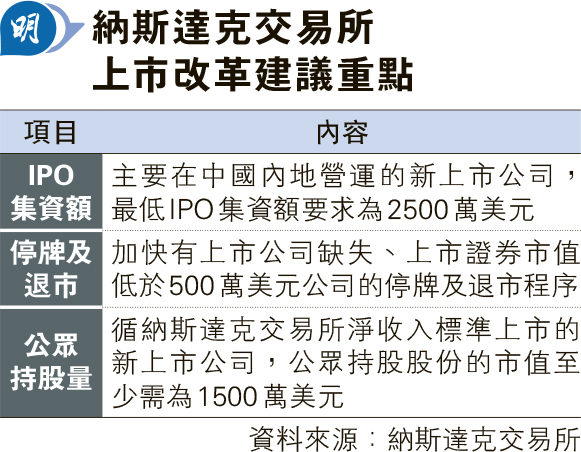 【明報專訊】納斯達克交易所美國時間本周三(3日)宣布,該所提議新一套於初始及持續上市優化標準,改革建議涵蓋首次公開招股(IPO)集資額、停牌及退市,以及公眾持股量。當中建議主要針對中國內地營運的新上市公司,其最低IPO集資額要求上調至2500萬美元(約1.95億港元)(見表)。納斯達克交易所表示,最新的上市改革建議,隨交易所積極主動檢視交易活動,特別於美國跨境交易並與潛在「唱高散貨」(pump-and-dump )有關的新興趨勢。
