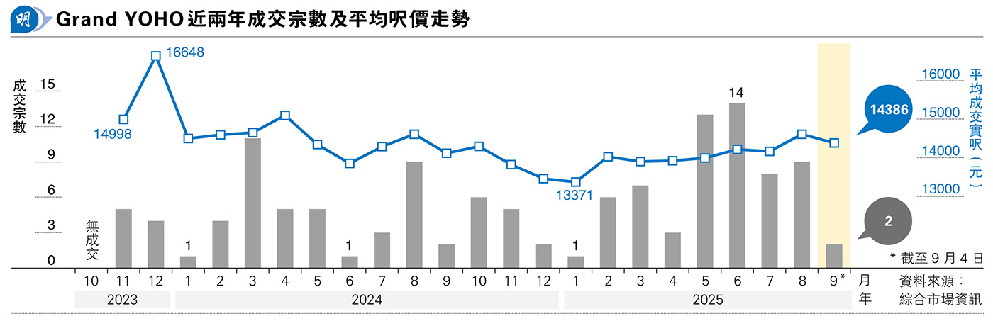 【明報專訊】市場預計美國聯儲局本月重啟減息,加上特首李家超新一份《施政報告》有機會推出利好經濟及樓市措施,令不少買家加快步伐入市;元朗指標屋苑Grand YOHO,9月截至4日暫錄約兩宗成交,且全為獲利個案。區內代理表示,隨屋苑有筍盤放售,料屋苑今個月成交有機會追平,甚至超過8月錄得9宗成交的水平。