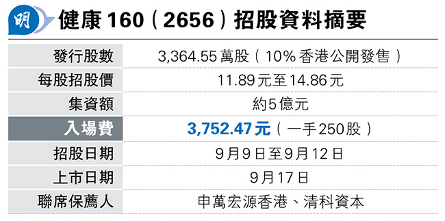 【明報專訊】中國醫藥健康用品批發商及數字醫療綜合服務提供商健康160(2656)昨日起至周五(12日)招股,計劃發行3364.55萬股,其中10%在本港公開發售,招股價介乎每股11.89至14.86元,集資約5億元。每手250股,一手入場費3752.47元,預期17日掛牌,聯席保薦人為申萬宏源香港及清科資本。健康160是次採用機制B發行,不設回撥。