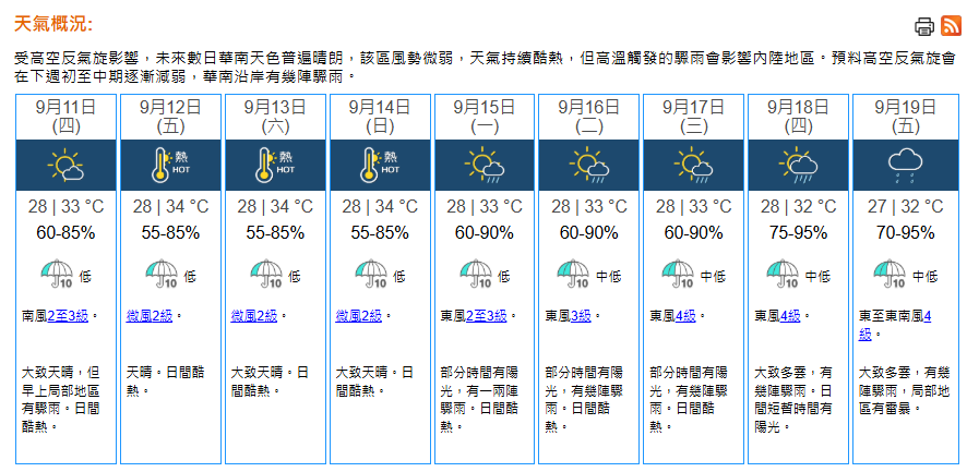 即時熱點 天氣|天文台:周四局部地區有驟雨 日間酷熱最高33°C (20:53) 發佈於 1 個月 前 2025 年 9 月 10 日 By 明報 天文台表示,本港周四(11日)初時大致多雲,局部地區有驟雨,漸轉天晴。早上最低氣溫約28°C。日間酷熱,最高氣溫約33°C。吹輕微至和緩偏南風。展望隨後兩三日大致天晴,持續酷熱。下周初部分時間有陽光,亦有幾陣驟雨。 相關文章:天文台天氣天氣速遞編輯推介 Up Next 查理斯晤哈里 兩父子吃下午茶 自2024年2月首會面 (13:41) 不要錯過 蘋果發布會本港時間周三凌晨舉行 料iPhone17改用eSIM【附直播連結】 (14:47) 繼續閱讀 贊助商 猜你喜歡 天氣|酷熱警告生效 天文台:周末有一兩陣驟雨 (08:22) 天氣|天文台:周四天晴局部地區有驟雨 最高32°C (20:56) 今年10月已有4日達33℃以上 破1884年以來紀錄 (17:45) 天氣|天文台:天晴酷熱最高33°C 局部地區有驟雨 (08:14) 天氣|天文台:周三天晴酷熱 最高33°C (21:00) 水利部和中國氣象局發布山洪預警 (22:56)