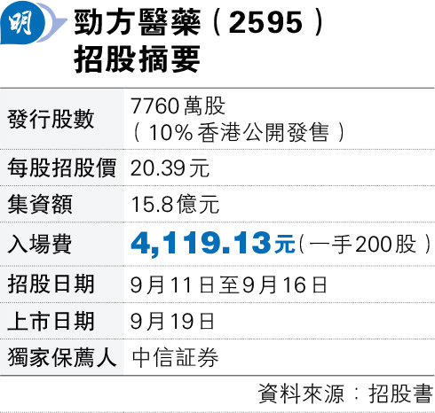 【明報專訊】生物製藥公司、18A生科股勁方醫藥(2595)昨日起至下周二(16日)招股,計劃發行7760萬股,其中10%在本港公開發售,每股招股價20.39元,集資約15.8億元。每手200股,一手入場費4119.13元,預期19日掛牌,中信証券為獨家保薦人(見表)。勁方醫藥是次採用機制B發行,不設回撥,發行人可酌情重新分配,令公開發售總數佔發售股份15%。