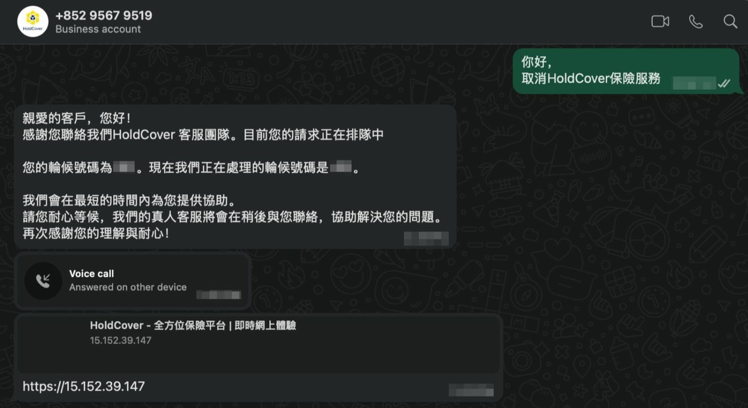 事主憶述早前收到電話號碼「5字頭」來電,稱「支付寶原有免費服務「HoldCover」保險服務將於下個月開始正式收費,每月收費為港幣1200元」,對方在通話中亦準確說出事主的英文全名及身分證號碼頭四個數字,並要求事主聯絡另一個不同號碼的WhatsApp賬戶取消服務。