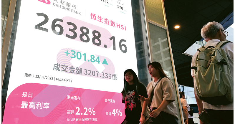 恒指承接美股做好而裂口高開453點,最高曾見26,585點,升499點,收報26,388點,升301點或1.16%,國指及科指分別升1.13%及1.71%,至9364點及5989點,其中科指曾升破6000關創半年高位。大市成交3207億元,北水淨流入73.31億元,較周四減61.39%。全周計,恒指累升3.82%,國指累升3.38%,同連升兩周;科指累升5.31%,更連升六周。