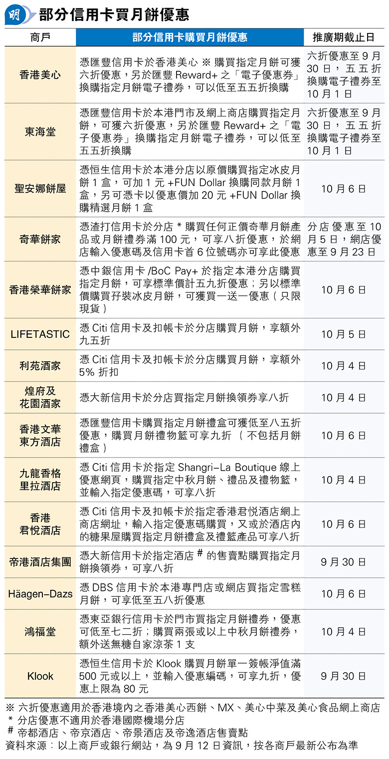 【明報專訊】踏入9月中,大部分商戶推出的月餅早鳥優惠已結束,即使錯過相關優惠,目前仍可享不少商戶與信用卡合作推出的購買月餅優惠,此類優惠的推廣期大多至10月初,若能配合信用卡其他簽帳優惠購買月餅自然可慳得更多,惟要留意相關簽帳是否能符合獲得優惠的條款。